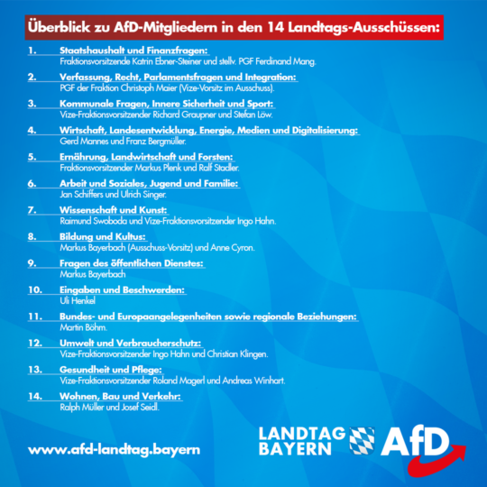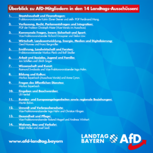 AfD-Bayern-Landtag-Fraktion-Ausschuesse jkn2018-11-29T12:59:44+01:00 Teilen Sie diesen Artikel! FacebookXLinkedInPinterestE-Mail